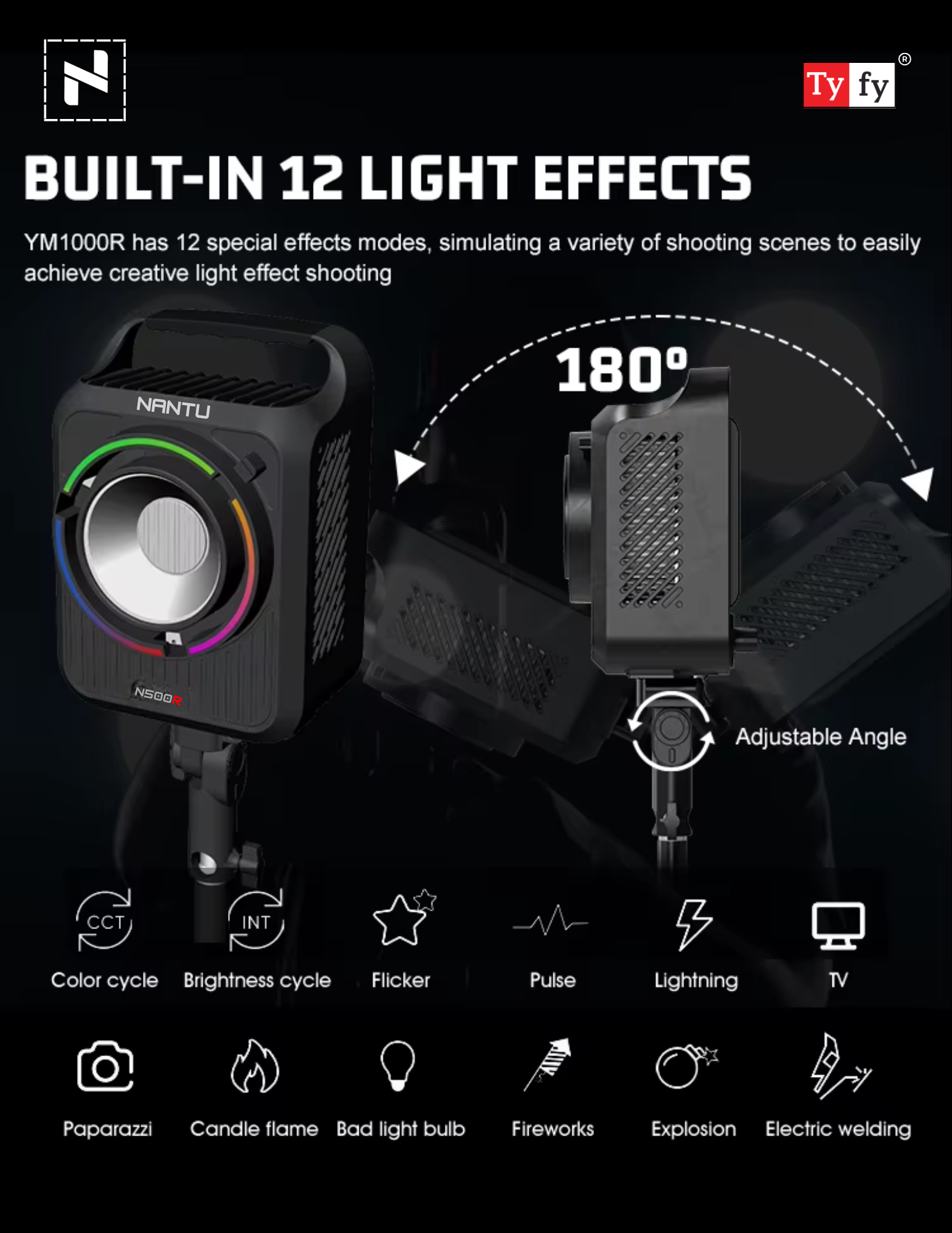 NANTU PRO N500 RGB COB WITH HANDLEGRIP design for professional Film lighting fixture commonly used in photography, videography, and studio productions.